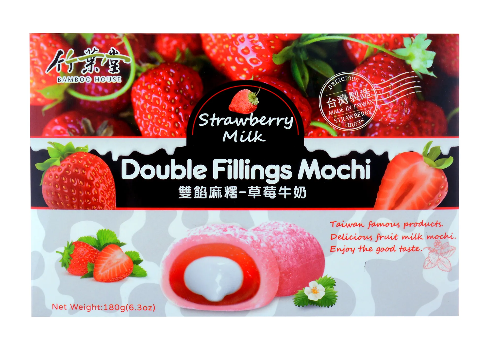 Моти с двойной начинкой - желе из клубники и сливочным кремом. Японский десерт моти - это шарики из рисового теста с начинкой внутри. Делается из истолчённого в пасту клейкого риса, который при долгом толчении и смачивании приобретает сладкий вкус. Моти BAMBOO HOUSE производят в Тайване из высококачественных ингредиентов.